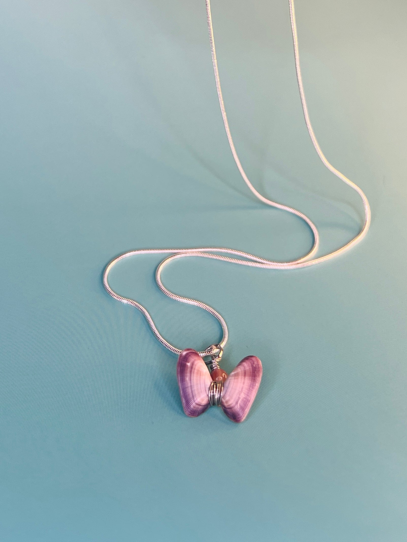 The Coquina Butterfly Necklace is a delicate piece that captures the beauty of nature in its purest form. Made from naturally paired Coquina shells, this butterfly-shaped pendant symbolizes transformation and grace. At its center, a softly polished bead enhances the design, creating a perfect harmony between the sea’s treasures and elegant craftsmanship. Ideal for those who cherish whimsical, ocean-inspired jewelry, this necklace is a timeless reminder of coastal charm and natural beauty.