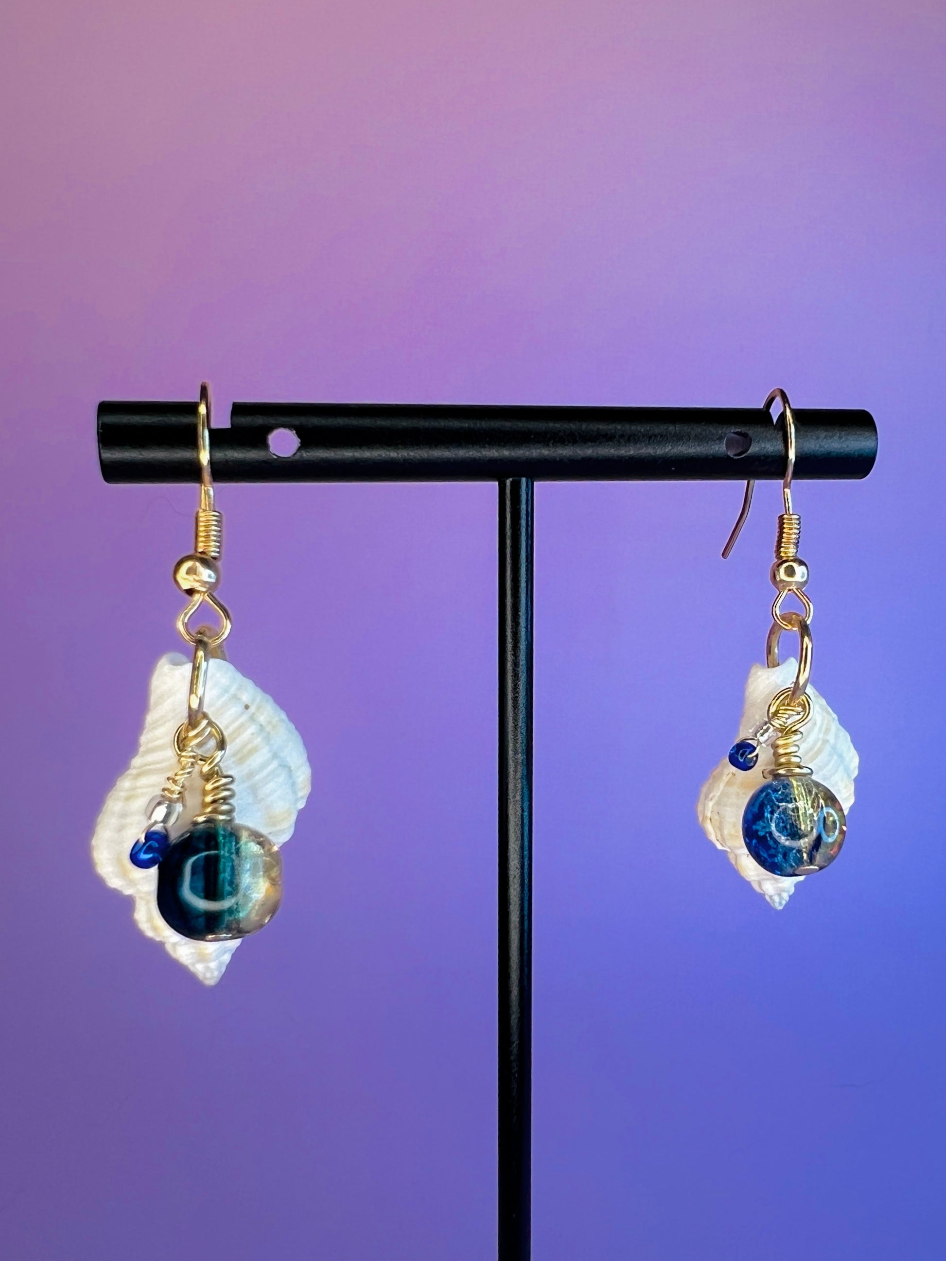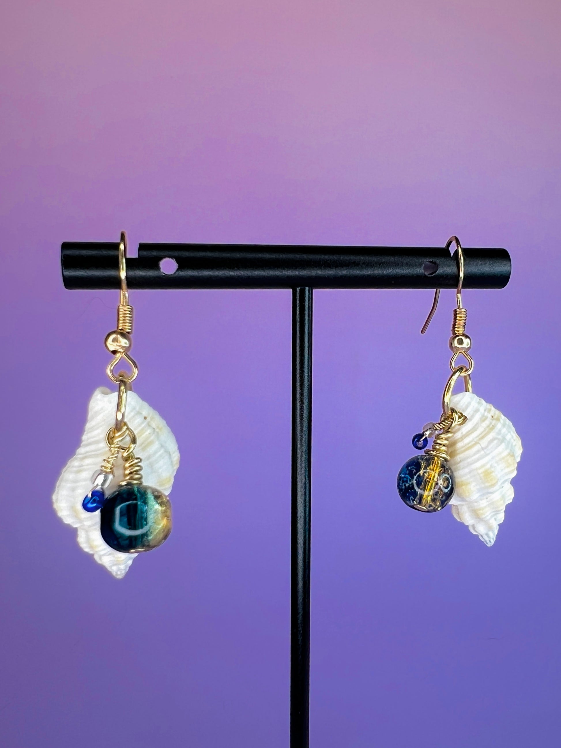 These Mini Conch Shell Earrings featuring vibrant glass beads, a perfect blend of coastal charm and artistic detail. Each earring showcases a delicate mini conch shell, accented by intricately wrapped gold-tone wire and striking glass beads in deep blue hues. The contrast between the natural shell and the shimmering beads creates a unique and eye-catching design, ideal for ocean lovers and those who enjoy a touch of bold elegance. Lightweight and versatile, these earrings add a playful yet sophisticated touch to any ensemble.