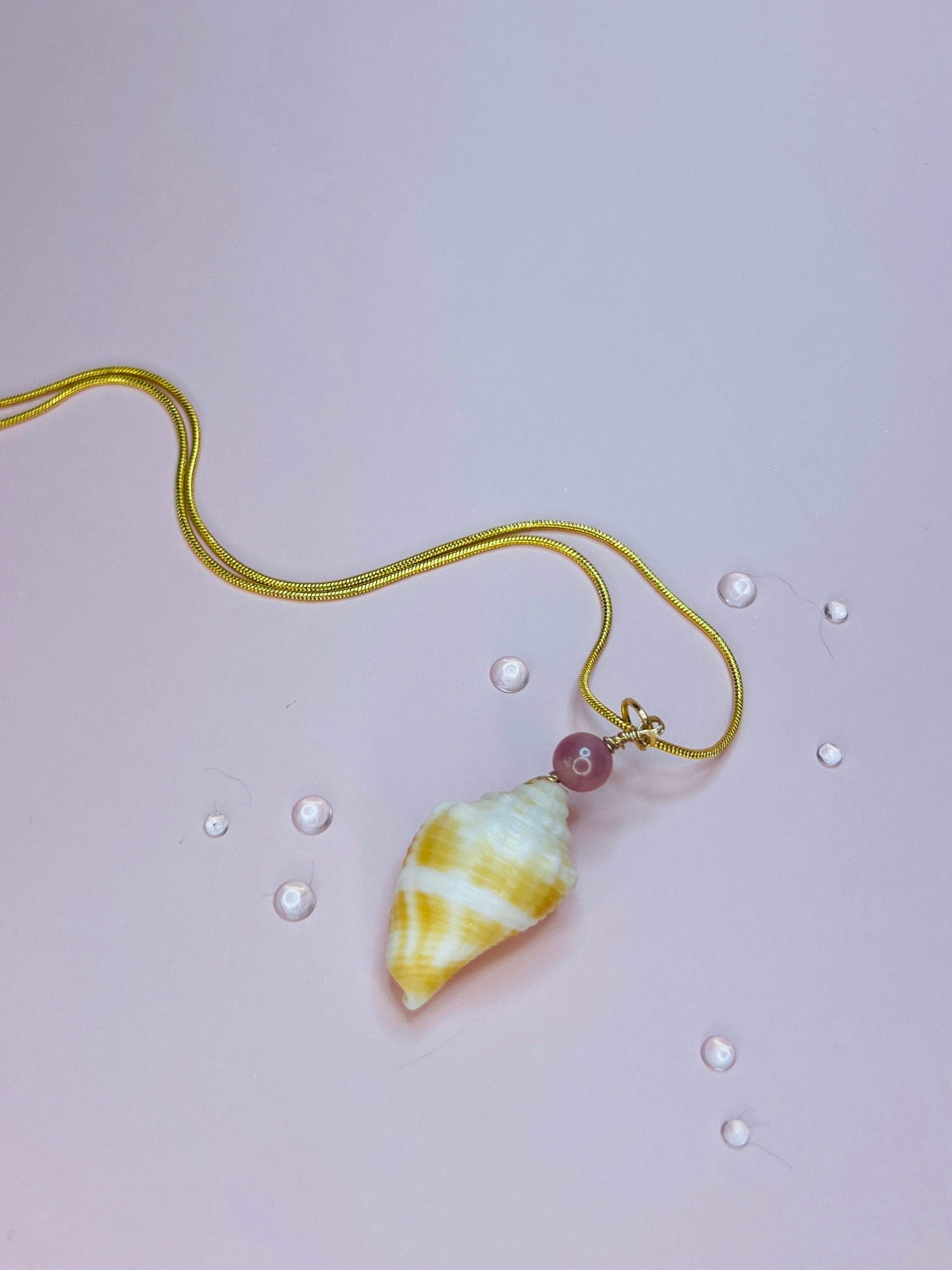 Introducing the Golden Sands Shell Necklace, a piece that captures the essence of the shore’s most captivating treasures. This necklace features a delicate spiral seashell, intricately wrapped and paired with a luminous pink gemstone, suspended from a soft golden chain that mirrors the warmth of the sun. Each shell is one of a kind, making every necklace as unique as the wearer. With its soft hues and natural textures, this enchanting accessory brings a touch of coastal charm to your style, reminding you of sun-drenched days and ocean-kissed breezes. Perfect for beach lovers and dreamers alike.